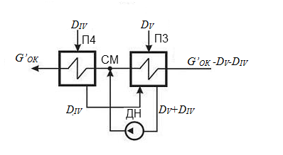 Количество пара 4-го отбора на входе П4 определяется на основании совместного решения уравнений теплового и материального баланса П4. Запишем уравнение ТБ сепратора, учитывающее материальный баланс.
