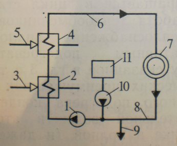 1— сетевой насос;2— основной сетевой подогреватель;3— греющая среда основного сетевого подогревателя;4— пиковый сетевой подогреватель;5— греющая среда пикового сетевого подогревателя;6— подающая магистраль сетевой воды;7— тепловой потребитель;8— обратная магистраль сетевой воды;9— продувка тепловой сети;10 — подпиточный сетевой насос;11 — установка подготовки добавочной воды теплосети.