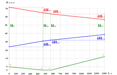 По результатам расчетов, на рисунке 2.1, построен пьезометрический график тепломагистрали №2 тепловых сетей поселка Инской.