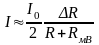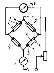 где I0 — сила тока питания моста; R — сопротивление терморезисторов 5; R — изменение сопротивлений плеч моста в рабочих камерах 1 и 3; RмВ — сопротивление милливольтметра.
