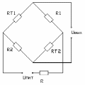 Чтобы обеспечить максимальную чувствительность мостовой измерительной схемы, необходимо чтобы Rl, R2, R3, R4 были равны при отсутствии силы, действующей на упругий элемент. Для равноплечего моста термокомпенсирующее сопротивление рассчитывается следующим образом: