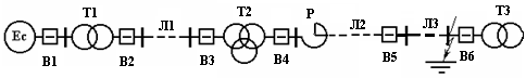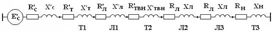 Схема на рис.1 включает источник тока Ес (генераторы), повышающий трансформатор Т1, включенных на ЛЭП Л1 110 кВ, понижающий трансформатор Т2, к которому на стороне 10.5 кВ последовательно включены линии Л2(35 кВ) и Л3(6 кВ), и группу из пяти трансформаторов нагрузки Т3(по 1.6 МВА).