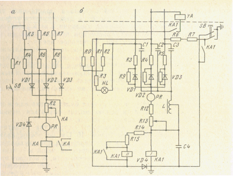 УАКИ — устройство автоматического контроля изоляции, выпускаемое для установки в сетях 380 и 660 В угольных шахт и карьеров, имеет в основе вентильную схему (рис. 6, б). Фильтр напряжения нулевой последовательности состоит из трех активных сопротивлений (R3, R4, R5)