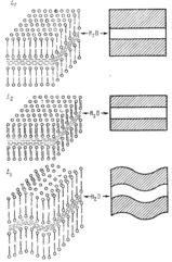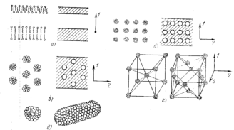 Група ліотропних рідких кристалів лінійної структури поділяється на три класи, які позначаються символами L1, L2, L3. Клас L1 – пластинчата структура – охоплює рідкі кристали, в яких молекули та іони розташовані в подвійних шарах, розділених водою. Цей клас кристалів називається мильними ядрами. Клас L2 – пластинчата структура – вміщує рідкі кристали з одиночними шарами молекул і іонів, розділених водою. Структурні схеми цих класів показані на рис. 5.2.1.13. Клас L3 – шарувата структура з подвійними шарами молекул і іонів, розділених водою. Осі молекул в шарах перпендикулярні до плоскості шарів ябо нахиленні під деяким кутом.