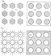 До групи РН відносяться також три класи. Клав РН1 містить комірці з гексагональним пакуванням в формі стрижнів з органічною серцевиною. Перетин стрижнів має форму кільця або шестигранника. Ця середня фаза або нормальна двомірна гексагональна структура в залежності від форми перетину стрижня. Клас РН2 містить комірці з гексагональним пакуванням в формі стрижнів з водною серцевиною. Перетин стрижня має форму кільця або шестигранника, це зворотна двомірна гексагональна структура (рис.5.2.2.15). Клас РН3 включає частки більш складної структури, оточенні водою та які мають гексагональне пакування – комплексна двомірна гексагональна структура.