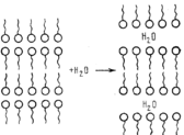 Процес проникання води в таку шарувату систему показан схематично на рис.5.2.11. Він заснований на впроваджуванні молекул води між шарами та набуханні амфіфільної речовини. В результаті цього утворюється бімолекулярне нашарування. Впроваджування води в твердий кристал амфіфільного ліпіду проходить тільки за певною, характерною для даної речовини температурою. Ця температура називається мінімальною температурою проникання або температурою пенетрації.