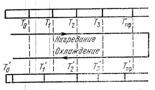 Рисунок 3.1.2 – Схема розподілу температур фазових переходів при охолодженні та нагріванні зразка