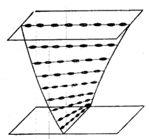 Надзвичайними оптичними властивостями володіють системи типу «закручений нематик». Таку систему можна отримати наступним чином: рідкий кристал поміщають між двома скляними пластинками, поверхні яких оброблені таким чином, щоб шар нематика орієнтувався пленарно, й пластини закручують відносно один одного на 90о. В результаті повороту пластин оптична ось нематика деформується (рис. 3.3.5). Шар закрученого нематика в паралельних поляроїдах дає темне поле зору, оскільки напрямок поляризації світла, що проходить через шар кристала, повертається на π/2. Більш ретельний експеримент Гука й Таррі показав, що світло, яке проходить через шар закрученого нематика, поляризований по еліпсу – поле зору затемнене не повністю.