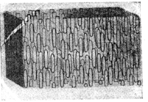 В деяких рідких кристалах можна спостерігати під мікроскопом наявність мікроструктур у вигляді ниток, кінці яких або вільні, або зв’язані зі стінкою ємності, в якій знаходиться речовина що досліджується. Такі речовини відносяться до групи нематичних рідких кристалів (“нема” – з греч. нить). Орієнтація осей молекул в цих кристалах паралельна, однак вони не створюють окремі шари. Довгі осі молекул лежать вздовж ліній, паралельних певному напрямку, а їх центри розміщенні хаотично (рис. 4.7). Нематичні рідкі кристали називаються також нематиками.