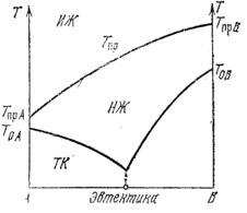 Дуже часто на практиці необхідно розширити температурний діапазон мезофази або збільшити різницю Тпр – Т0 між температурою просвітління або плавлення рідкого кристала. З цією цілю різні рідкі кристали перемішують в таких пропорціях, щоб утворилась евтектична суміш. Температура плавлення Т0 такої суміші має різко виражений мінімум, який нижче температури плавлення кожного з компонентів. Величина температури просвітління буде проміжною між температурами просвітління кожного з компонентів суміші (рис. 3.1.3).