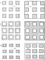 До групи Р відносяться три класи (рис. 5.2.2.14). Клас Р1 містить агрегати молекули – комірці – в формі стрижнів з органічною серцевиною, оточені водою. Перетин стрижнів в основному чотирьохкутне. Це нормальна двомірна тетрагональна структура Р1. Клас Р2 включає комірці в вигляді стрижнів з водною серцевиною. Перетин стрижнів квадратний. Цей клас називається зворотною двомірною тетрагональною структурою. Клас Р3 охоплює комірці ромбоедричного пакування в формі стрижнів з органічною серцевиною, оточенні водою. Перетин стрижнів прямокутний – нормальна двомірна прямокутна структура.