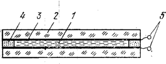 Рисунок 3.2.4 – Вічка типу «сендвіч». 1 – рідкий кристал, 2 – скляна пластина, 3 – провідний шар, 4 – прокладка, 5 – висновки