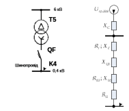Рисунок 5.1 – Принципова схема і схема заміщення для розрахунку три фазного КЗ в мережі 0,4 кВ