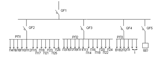 В схеме распределения электроэнергии для защиты электроприемников от токов короткого замыкания и перегрузок используются автоматические выключатели с комбинированными расцепителями.