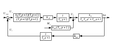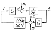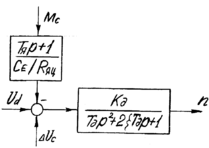 При определении передаточной функции электродвигателя за выходную переменную следует принимать частоту, вращения вала n, за входное задающее воздействие - напряжение Ud, в качестве возмущающего воздействия - отклонение напряжении сети Uc. Следует учесть, что динамические свойства электродвигателя характеризуются двумя постоянными времени: электромагнитной