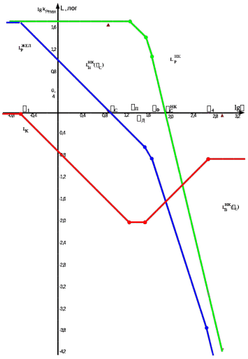 На рисунке 13 приведена наиболее типичная для заданных вариантов ЛАЧХ Lнкp() некорректированной САУ в разомкнутом состоянии, построенная по данной методике. Параметры системы таковы, что некорректированная САУ либо неустойчива, либо имеет малый запас устойчивости, не удовлетворяющий требованиям обеспечения заданного качества регулирования. Для примера, на рисунке 13, определяя значение ФЧХ в частоте нкс среза некорректированной САУ, имеем Lнкв(нкс) = - 4 лог, Lнкн(нкс) = 1,67 лог и