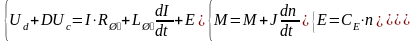 - Электродвигатель постоянного тока независимого возбуждения с рабочей машиной, при допущениях постоянного магнитного потока двигателя, скомпенсированной реакции якоря двигателя, абсолютно жёстких механических соединениях и постоянном моменте инерции J привода, описывается системой уравнений, состоящей из дифференциальных уравнений баланса напряжений якорной цепи и движения привода, а также соотношений между э.д.с. Е и частотой вращения n, электромагнитным моментом М и током I якорной цепи: