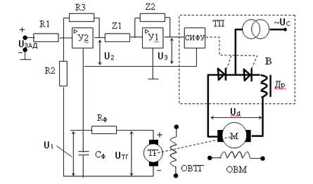На рис.1 приведена принципиальная схема замкнутой системы электропривода, состоящего из: