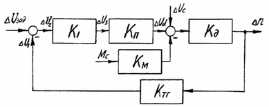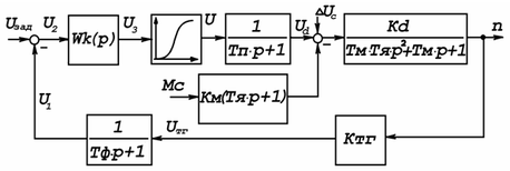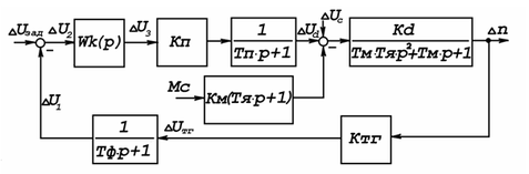 Линеаризованная структурная схема САУ получается, если полные переменные Х (Uзад, U2, U3, Ud, Uc, I, M, Mc, n, Uтг, U1) представить в виде суммы ХA+X, где ХA - значения переменных в рабочей точке А статических характеристик звеньев. После сокращения статических составляющих в правой и левой части уравнений звеньев, линеаризованные структурные схемы звеньев отразят зависимость между приращениями выходных и входных переменных (Uзад, U2, …, U1). Форма записи передаточных функций линейных звеньев при этом не изменяется, а статические характеристики нелинейных безынерционных звеньев будут представлены в виде коэффициентов динамической линеаризации в рабочей точке.