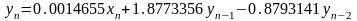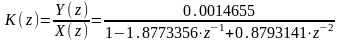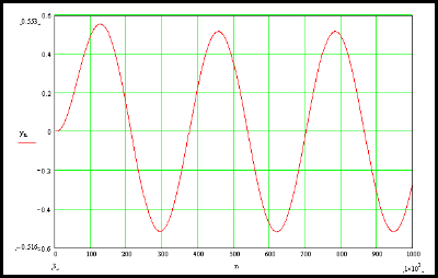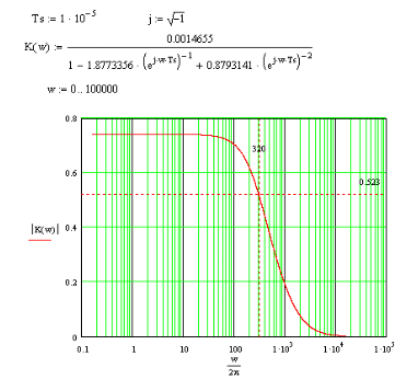 Анализируя график можно сказать, что после переходного процесса наблюдается гармонический сигнал. Из рисунка видно, что цифровой фильтр пропускает гармонический сигнал с частотой, близкой к частоте среза ЦФ, с амплитудой примерно равной 0.707Kmax.