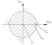 Т. к. полюса (корни характеристического уравнения) лежат внутри окружности, то ЦФ устойчив. Но как видно из рисунка устойчивость его мала, он находится почти на грани устойчивости. Чем ближе значения полюсов к центру окружности, тем устойчивее ЦФ.