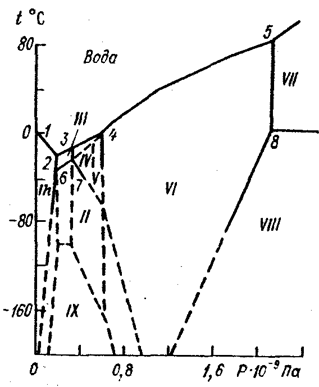Кривая плавления льда V и VII исследована до давления 20 Гн/м2 (200 тыс. кгс/см2). При этом давлении лёд VII плавится при температуре 400°С.