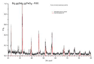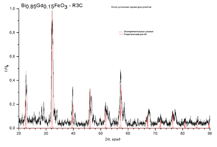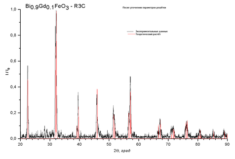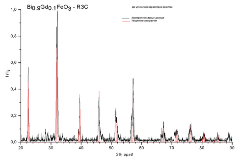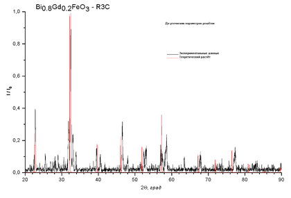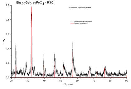 Для GdxBi1-xFeO3 рассчитывались рентгенограммы и строились ячейки в пространственной группе 161 (R3c), так как в силу особенностей синтеза это вещество может принадлежать к той или иной пространственной группе.