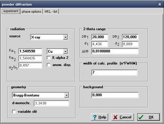 Для рентгеновского излучения можно использовать следующий материал анода: Cr, Mn, Fe, Co, Ni, Cu, Zr, Nb, Mo, Ag и W. Только для этих излучений соответствующие поправки (глубина проникновения, массовый коэффициент поглощения) принимаются в учет при расчете порошковой дифрактограммы. Это важно, например, для количественного фазового анализа. Результирующая порошкограмма также зависит от используемой геометрии дифракции. PowderCell рассчитывает рассеяние в геометрии Брэгга-Брентано (Bragg-Brentano) и Гинье (Guinier). В этом случае предполагается использование {011} - кварцевого монохроматора.