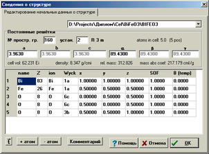 1.2 В появившемся диалоговом окне (рис.1) введите название вещества, номер пространственной группы, параметры элементарной ячейки, координаты атомов в элементарной ячейке, значения структурного и температурного факторов.