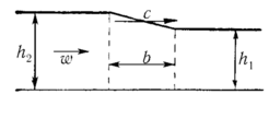 Пусть на поверхности воды над плоским дном распространяется со скоростью с справа налево «вал» воды шириной b, повышающий уровень воды от h1 до h2 (рисунок 4.4). До прихода вала вода находилась в покое. Скорость её движения после повышения уровня ω. Эта скорость не совпадает со скоростью вала, она необходима для того, чтобы вызвать боковое перемещение объёма воды в переходной зоне шириной b вправо и тем самым поднять уровень воды.