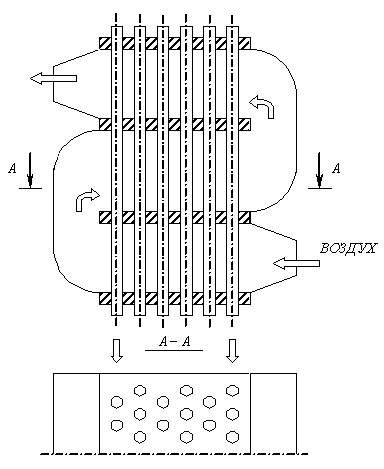 В настоящее время наибольшее распространение получили стальные трубчатые воздухоподогреватели. Их изготавливают из труб диаметром 43..51 мм и толщиной стенок 1,5..2 мм. Трубы располагают вертикально в шахматном порядке и приваривают к двум трубным решеткам, образуя отдельную секцию, называющую кубом воздухоподогревателя. Воздухоподогреватель собирают обычно из нескольких кубов, соединенных между собой перепускными коробами. Дымовые газы движутся внутри труб, воздух, нагнетаемый вентилятором омывает их снаружи в поперечном сечении.