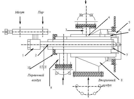 Таким образом, в горелках происходит подача газа в массу воздуха мелкими струйками, а также завихрение газовоздушного потока, что обеспечивает качественное и быстрое смешение газа воздуха. Газомазутная горелка снабжена паромеханической форсункой для сжигания мазута, состоящей из корпуса 1, центрального ствола 2 и распыляющей головки 7. Мазут подается по внутренней трубе ствола 2, проходит через распределенную шайбу и поступает в топливный завихритель. Пар подается по наружной трубе 10 и попадает в паровой завихритель в зоне головки форсунки 7. Таким образом достигается паромеханическое распыление топлива. Образовавшаяся взвесь смешивается с необходимым количеством воздуха, после чего поступает в топку, где и сгорает.