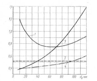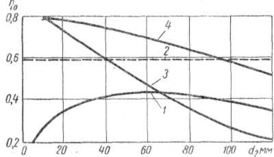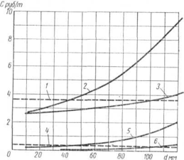 Пользуясь кривыми, приведенными на рисунке 6.1 для к. п. д. ήо, и значениями электрического к. п. д., получим стоимость воды, отнесенную к 1 т металла, в зависимости от диаметра нагреваемых заготовок (кривые 4—6 на рисунке 6.2).