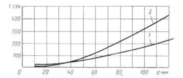 Рисунок 6.4 - Зависимость времени нагрева заготовок различными способами от диаметра последних: 1 — электроконтактный; 2 — индукционный.