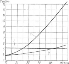 На рисунке 6.3 приведены кривые, показывающие зависимость стоимости нагрева 1 т металла от диаметра нагреваемых заготовок.