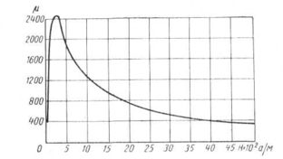 Из кривой видно, что при определенном значении тока или напряженности магнитного поля магнитная проницаемость достигает максимума, после которого она сравнительно быстро падает до примерно постоянного значения, мало изменяющегося с дальнейшим повышением тока.