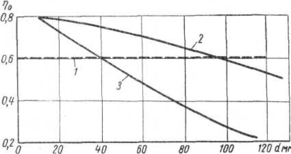 На рисунке 6.1 приведены кривые зависимости общего к. п. д. установок электроконтактного нагрева от диаметра нагреваемых заготовок. Если при электроконтактном нагреве соблюдается условие l2/d2 > 1, то общий к. п. д. практически не зависит от диаметра заготовок при соблюдении условия формулы (42).