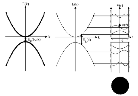 Ефект квантового обмеження знову значний. Більш обмежені носії заряду призводять до більшого розділення між індивідуальними рівнями енергії, а також до більших значень нульової енергії. Якщо носії поміщені у сферу діаметром