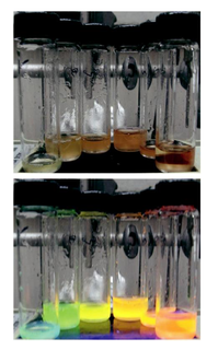різного розміру, розчинені у хлороформі. Розмір квантових точок зростає зліва направо. а - фотографія розчинів; б - фотографія розчинів при УФ-опроміненні знизу. Спостерігаються різні кольори флуоресценції.