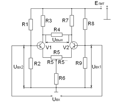 В данном курсовом проекте для уменьшения дрейфа в усилителе постоянного тока применил балансную (дифференциальную) схему. Наибольшее распространение получила схема параллельного баланса, представлена на рисунке приложения В, называемая также дифференциальным усилителем. Дифференциальный усилитель обеспечивает высокое усиление дифференциального входного сигнала Uвх. д, приложенного между входами каскада, и практически не усиливает синфазный сигнал, одинаковый на обоих входах.