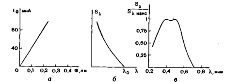 Рис. 1.1 – Світлова (а) та спектральні характеристики фотокатода (б, в)