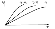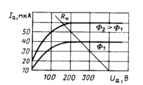 Анодна характеристика ФЕП показує залежність анодного струму (або анодної чутливості) від напруги між анодом та останнім динодом. На рис. 2.13 зображене сімейство анодних характеристик ФЕП при різних потоках випромінювання та незмінній напрузі на каскадах посилення.