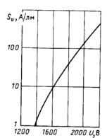 Залежність анодної чутливості від напруги живлення ФЕП показана на рис. 2.12. Зі збільшенням напруги чутливість, пропорційна коефіцієнту підсилення ФЕП, росте за степеневим законом. Швидкість росту (нахил характеристик) залежить від помножувально-емісійних властивостей динодів і числа каскадів помножувальної системи. У паспортах ФЕП звичайно указують фіксовані напруги живлення, що відповідають номінальним значенням світлової анодної чутливості: 1,3,10, 30, 100 А/лм…