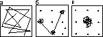 Рис. 4. Схематическое изображение траекторий движения частиц в газе (а), жидкости (б) и кристалле (в), при условии, что положения частиц во всех фазах фиксируются через равные промежутки времени. На двух последних рисунках точками обозначены атомы-соседи.