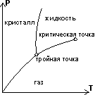 Рис. 3. Фазовая диаграмма для области относительно малых давлений и температур. При условиях, соответствующих точкам пограничных линий, фазы находятся в равновесии; при условиях, соответствующих тройной точке, система состоит из твердой, жидкой и газообразной фазы одновременно. В критической точке жидкость и пар становятся тождественными по своим физическим свойствам; за этой точкой эти две фазы неразличимы.