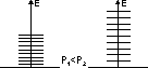Рис. 5. Распределение уровней энергии, на которых располагаются электроны кристалла при меньшем (слева) и большем (справа) давлении.