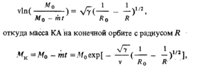 где и' и v – приращение скорости КА и скорость истечения рабочего вещества соответственно; Мо – начальная масса КА; Мк = Мо – mt – масса К А на конечной орбите. Здесь t – время перехода между орбитами; т – расход массы рабочего вещества. Из (1.1) приращение скорости