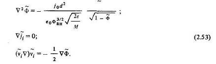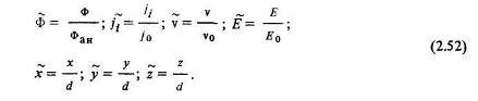 Введем масштабы величин, входящих в основные уравнения и в граничные условия. В качестве масштаба потенциала естественно принять потенциал анода Фан, в качестве линейного масштаба – ускоряющую длину а, в качестве масштаба скорости – скорость v0 = V-Фан приобретаемую ионами при прохождении разности потенциалов, равной масштабу потенциала. За масштаб плотности ионного тока примем среднюю плотность ионного тока /0 на анодной поверхности (поверхности ионного источника), за масштаб напряженности – среднюю напряженность электрического поля в ускоряющем пространстве Ео = Фан/У. Безразмерные переменные условимся отмечать значком ~: