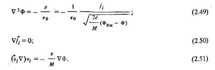 Таким образом, в геометрически подобных ионно-оптических системах ионные течения будут подобными, если они характеризуются одинаковыми значениями критерия у и если граничные условия на поверхностях электродов могут быть представлены в виде тождественных безразмерных соотношений. В подобных ионных течениях геометрические характеристики ионных пучков (в частности, расходимость пучка) совпадают, а параметры течения (Ф, р,/7, v) в сходственных точках ускоряющего пространства определяются по соотношениям (2.52).