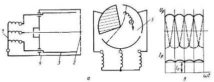 При горении разряда на аноде наиболее положительной фазы через нее протекает весь разрядный ток /р. В этот момент аноды других фаз выполняют функции коллектора хаотического ионного тока, величина которого не превышает 0,5 – 1% /р. Поэтому контакт анод–плазма обладает вентильными свойствами, и разрядную цепь следует рассматривать как обычный однотактный выпрямитель с закороченным выходом.